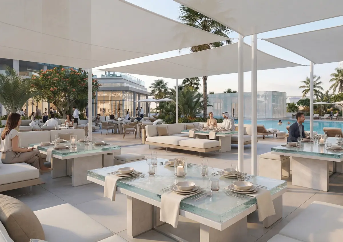 The architecture features a modern glass facade, open terraces, and elevated leisure areas on the podium. This maximizes views of the sea. The large balconies, transparent railings and open terraces provide a seamless link between the indoor spaces and the Gulf coastline. This structure allows daylight to penetrate each apartment, which increases energy efficiency and comfort. It is unique because it doesn’t follow a traditional residential design. It offers a resort-style environment, where lifestyle and investment value are aligned within one destination.