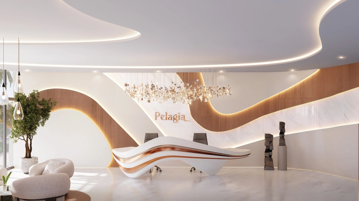 Pelagia features a variety of spacious homes, from comfortable 1-bedroom apartments (up to 1,405 sq. ft.) to large penthouses (up to 5,747 sq. ft.) Each home has been carefully designed to maximize natural lighting, and offer stunning views of Arabian Gulf. Pelagia, influenced by ancient Vastu, creates spaces that are filled with harmony, peace and tranquility, providing a luxurious lifestyle to residents.